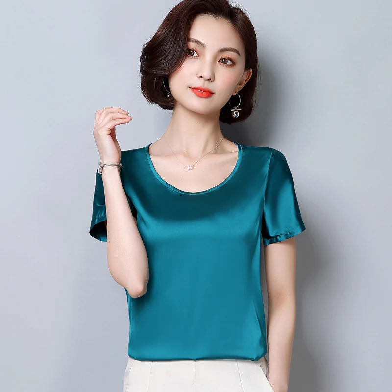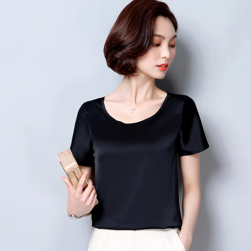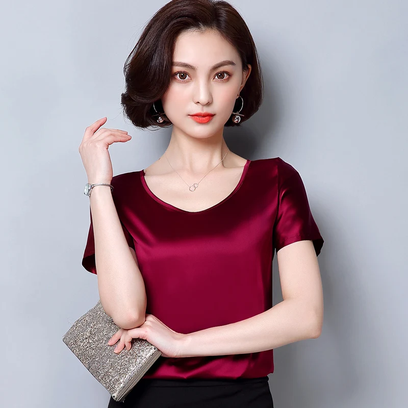 Buy plus size Silk O-neck sling top satin short sleeve stretch shirt Solid blouse womens tops and blous