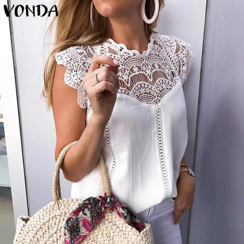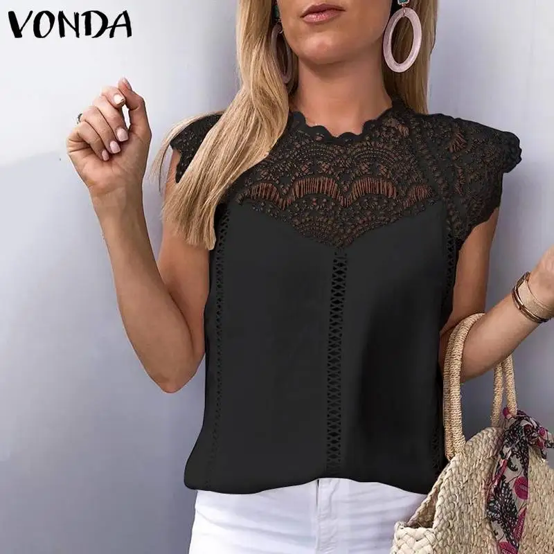 Best VONDA Women Shits Blouse Woman 2019 Sleeveless Tops Lace Shirt OL Office Ladies Shirts Hollow Party
