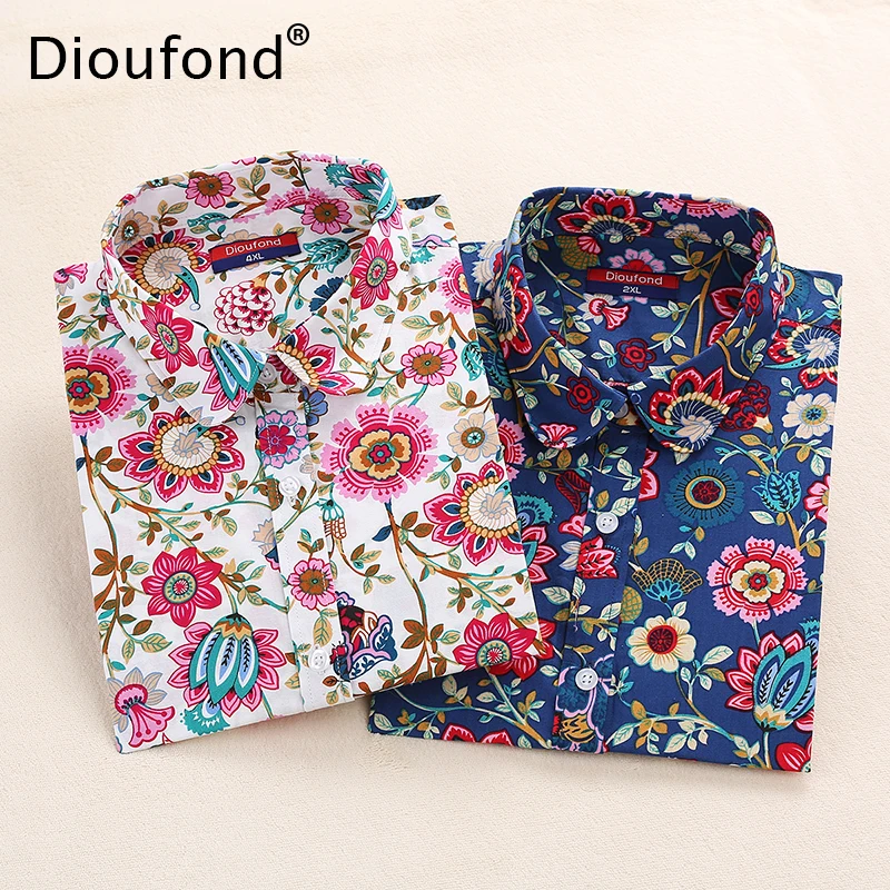 New Dioufond Vintage Blouses Women Print Shirts Long Sleeve Cotton Tops Ladies Floral Blusas Plus Size