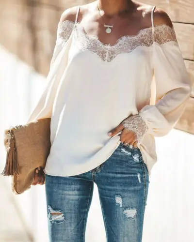 New 2019 New Hot Summer Fashion Latest Women Sexy Off Shoulder Long Sleeve Lace Patchwork Shirt Casual