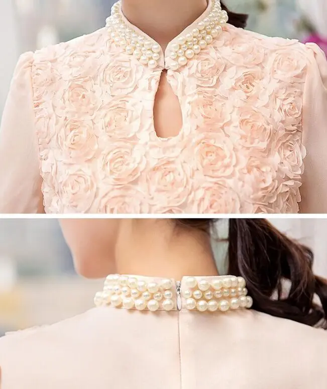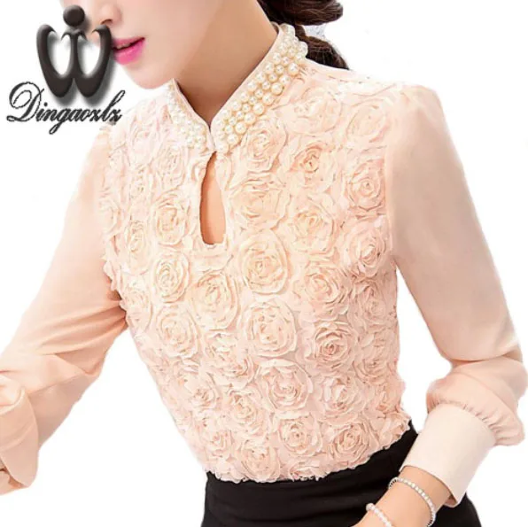 New Dingaozlz New Plus size Women Chiffon blouse Sexy Flower Beaded lace Tops long sleeved Casual shirt