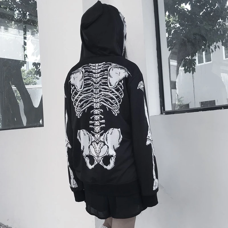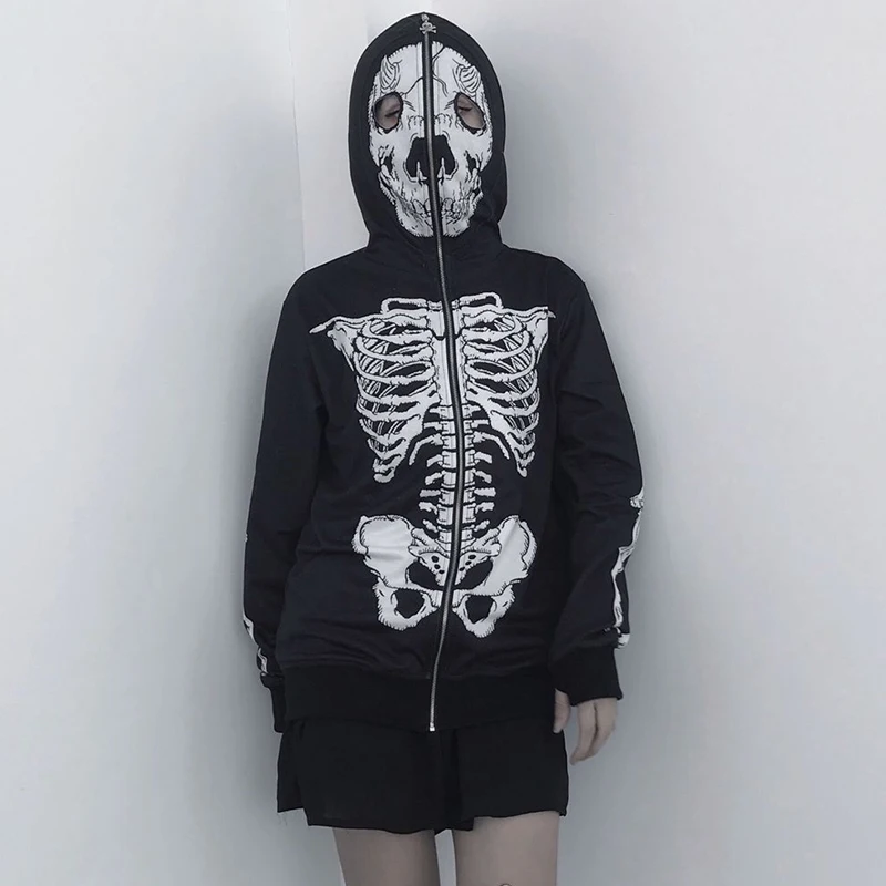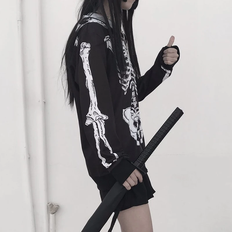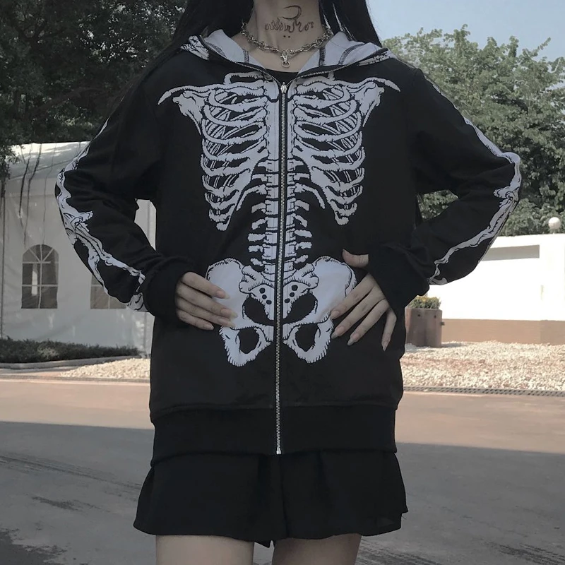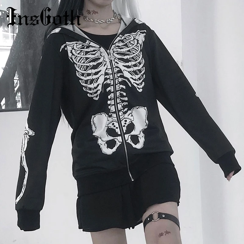 Best InsGoth Skull Printed Women Hooded Sweatshirts Gothic Halloween Party Black Hoodies Loose Oversize
