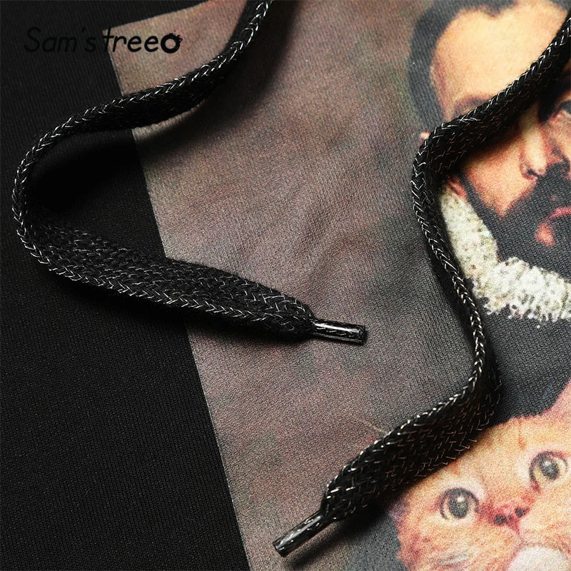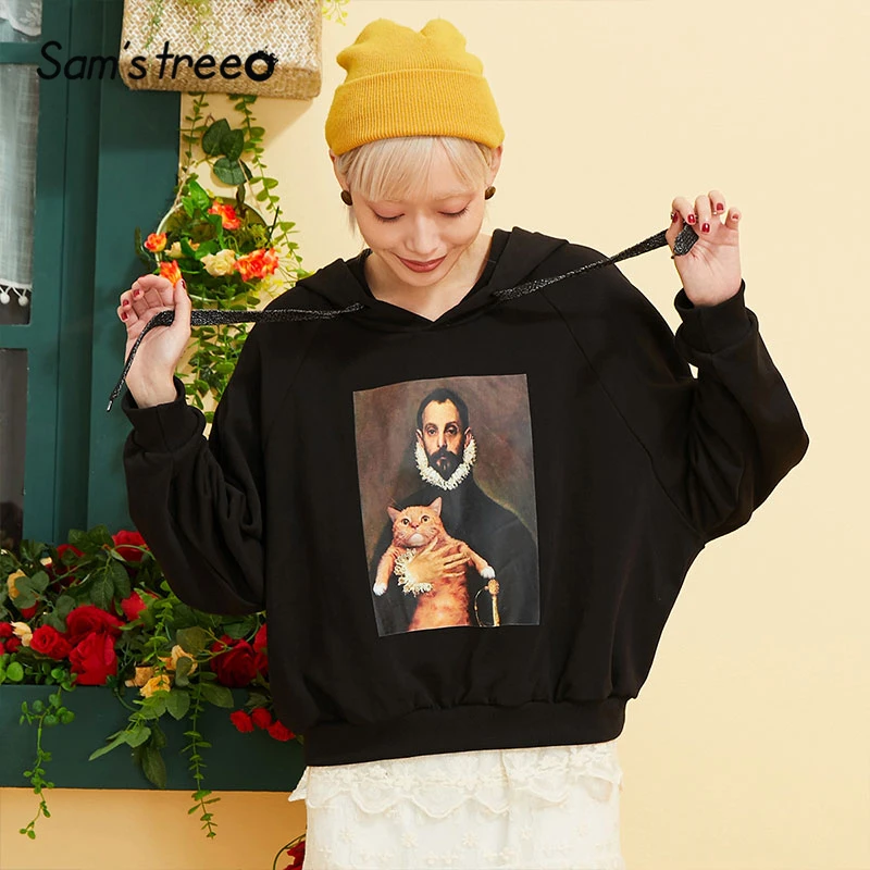 Promo Samstree Black Carton Print Drawstring Hoodies Retro Leisure Sweatshirt Women 2019 Autumn White Spo