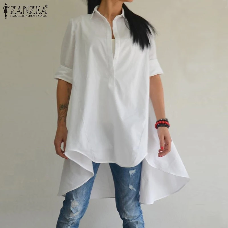 New Women Blouse Shirt ZANZEA Ladies Loose Long Sleeve Cotton Shirt Asymmetrical Hem Work Office Tunic