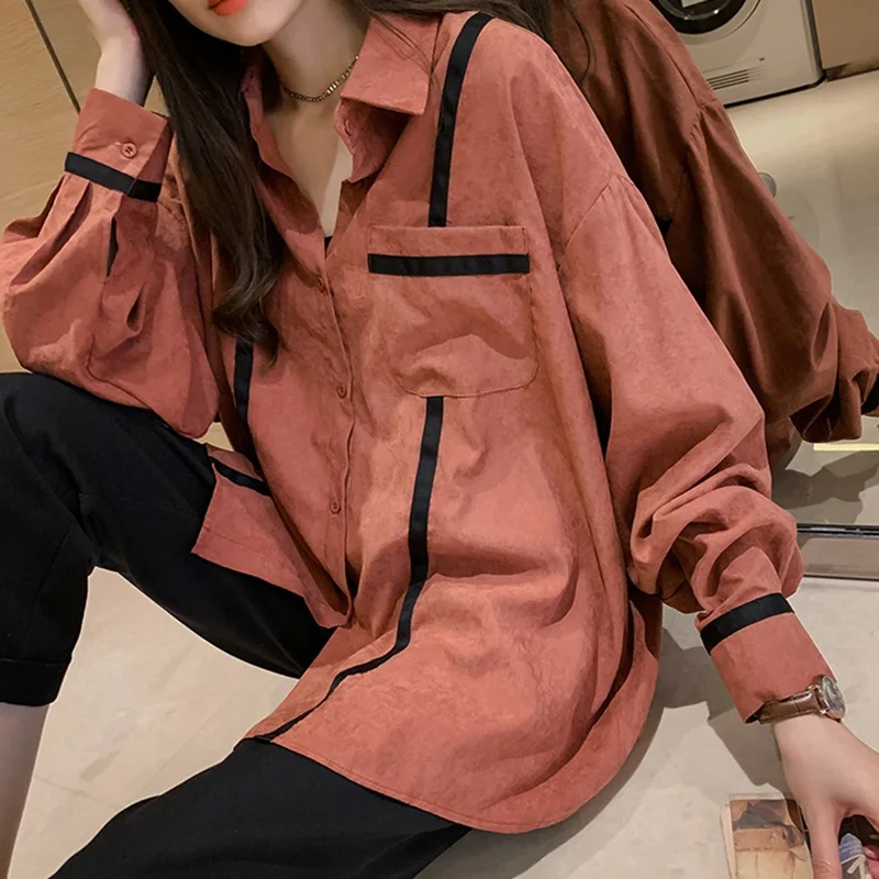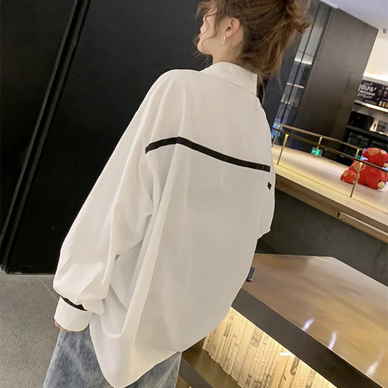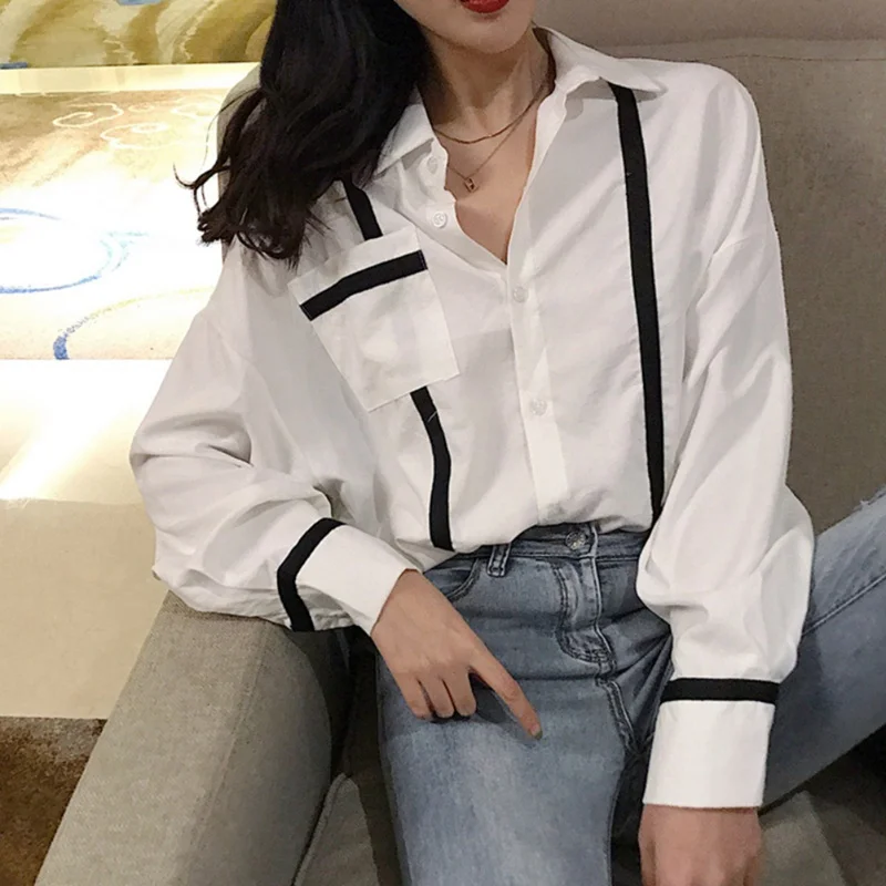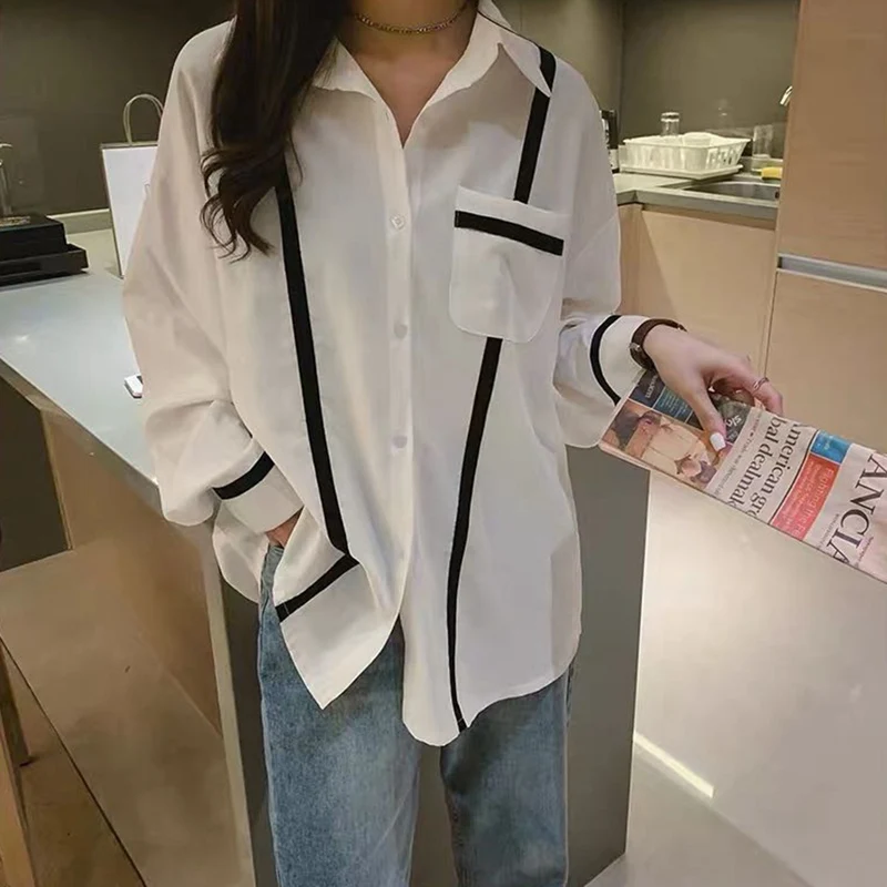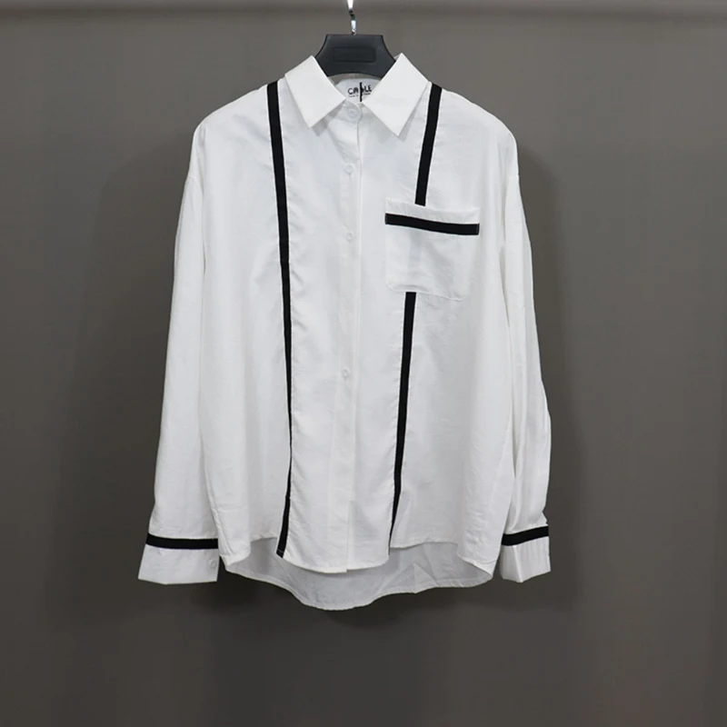 Best Summer Autumn Loose Lazy White Shirt Linen Color Matching Pocket Ladies Long Sleeve Turn-down Colla