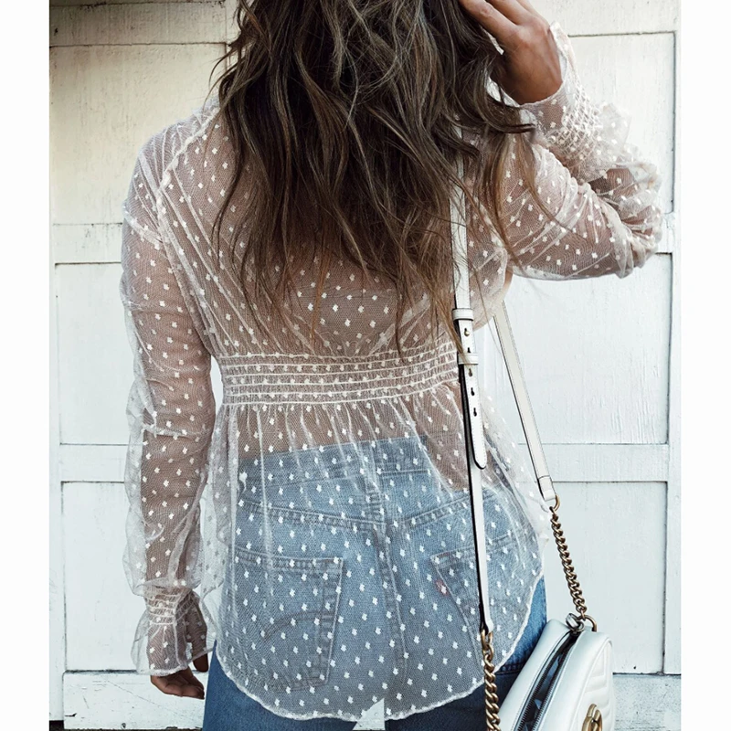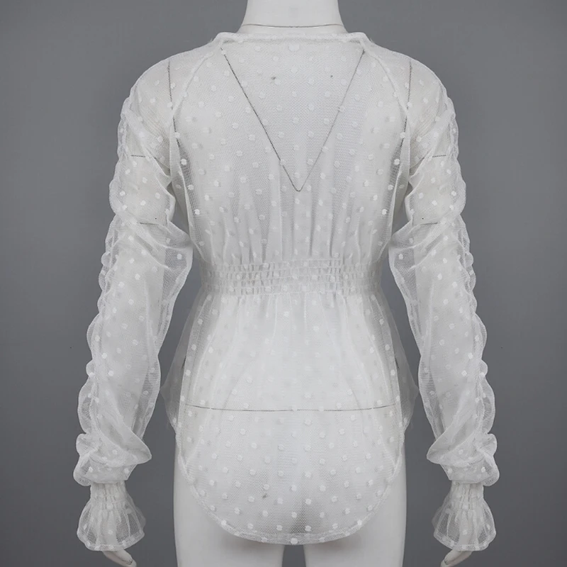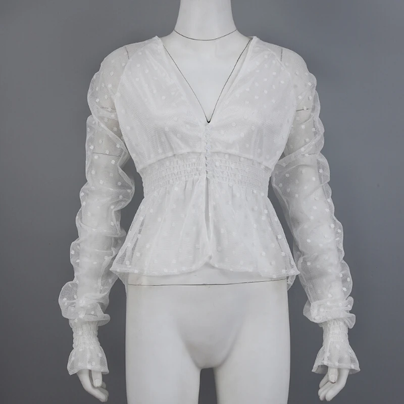 Buy Women Sexy Mesh Sheer Blouse Shirts Slim Tops Ladies Long Sleeve Ruffle Deep V Neck Solid Casual Su