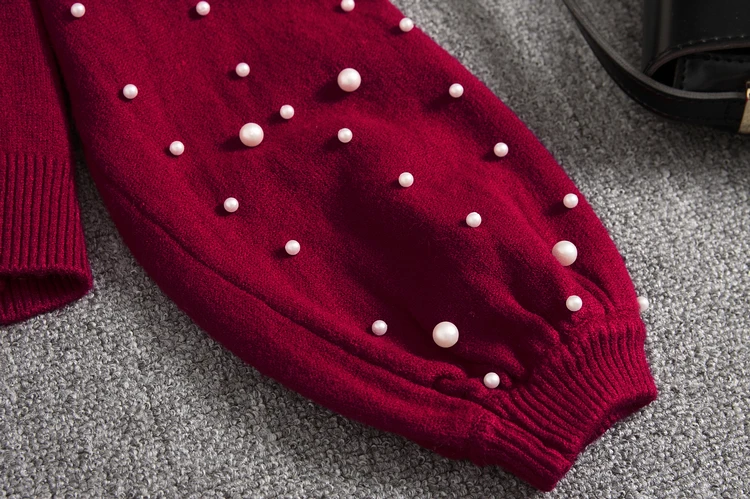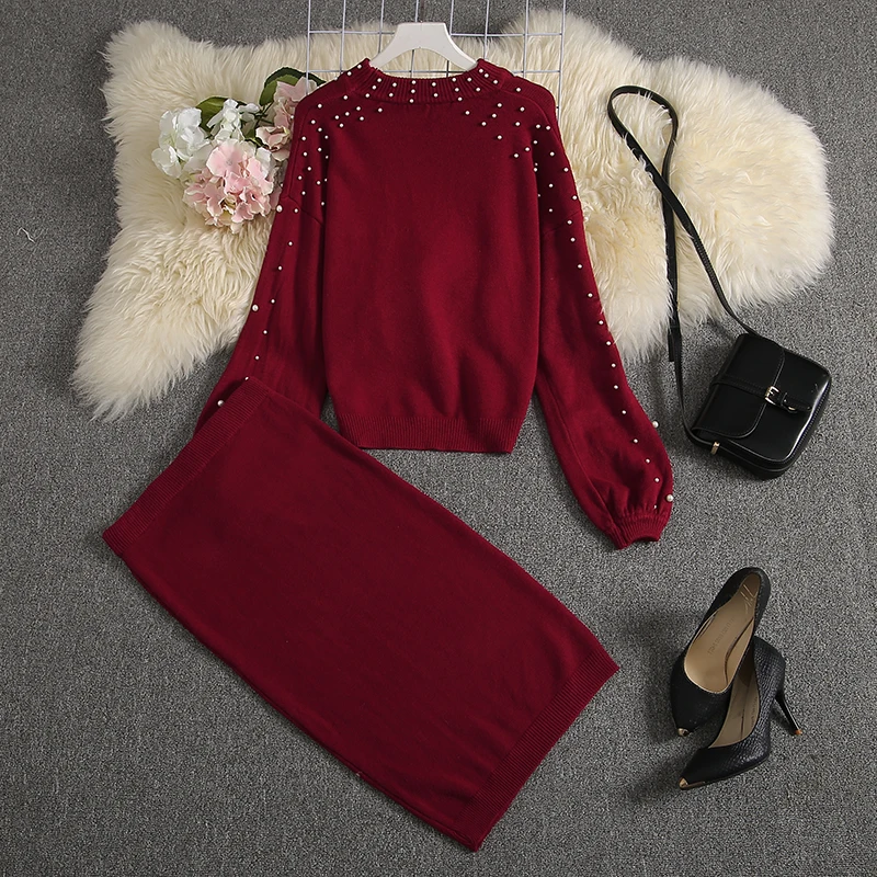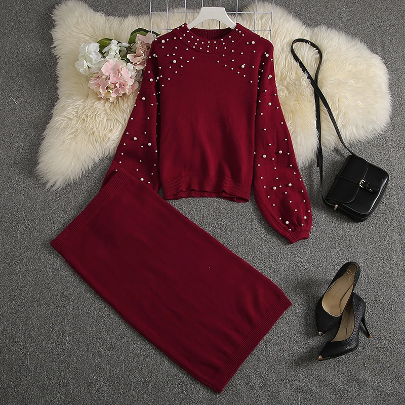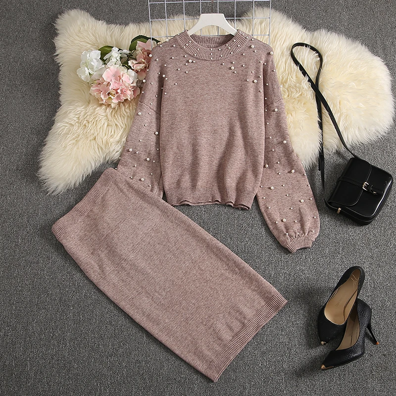 Buy ALPHALMODA 2019 New Women Sweater Skirt Suits Loose Pullover Pearl Jumper + Knee Length Knit Skirts