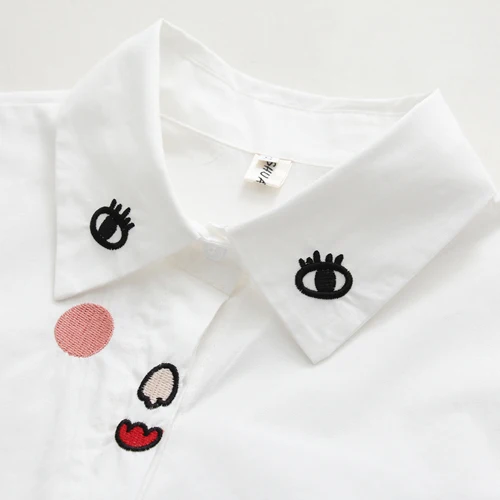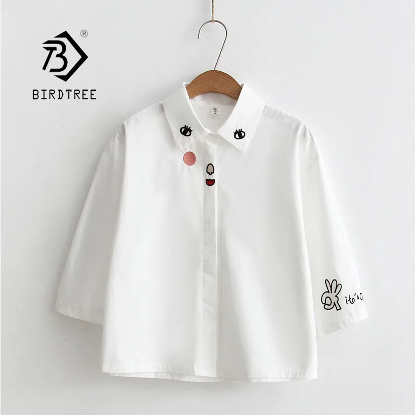 Promo 2019 New White Office Lady Shirt Button Turn Down Collar Three Quarter Sleeve Cotton Face Embroider