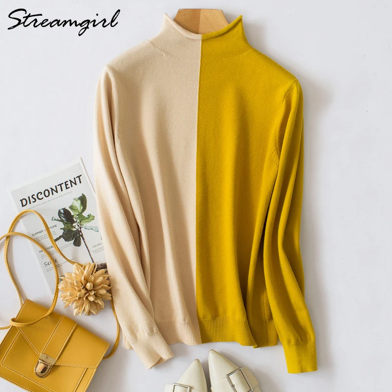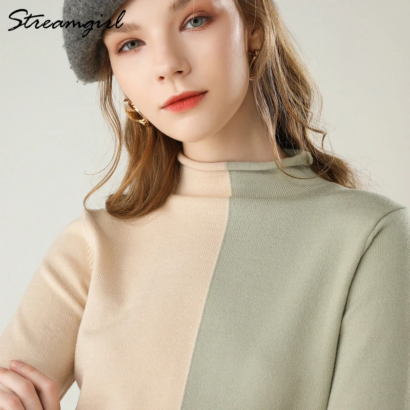 Best Patchwork Sweater Turtleneck Women Wool Blends Sweater Woman Pullover Sweaters Female Patchwork Wom