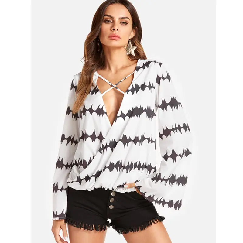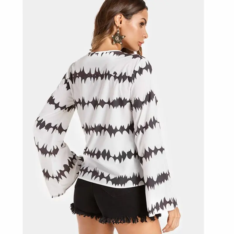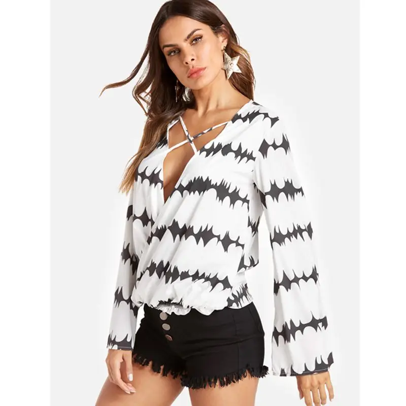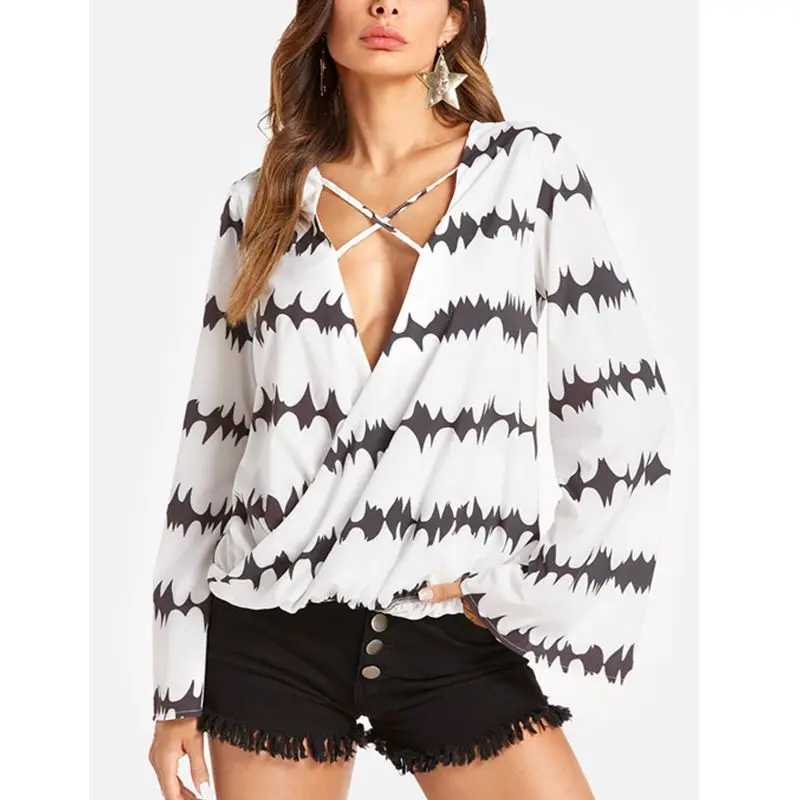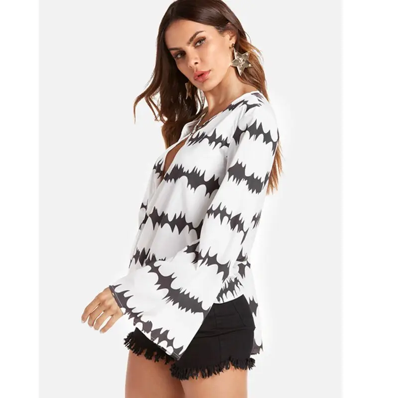 New Plus Size White Random Blouse Shirts Women 2019 Autumn Sexy V-Neck front Long Sleeves Chiffon Flora